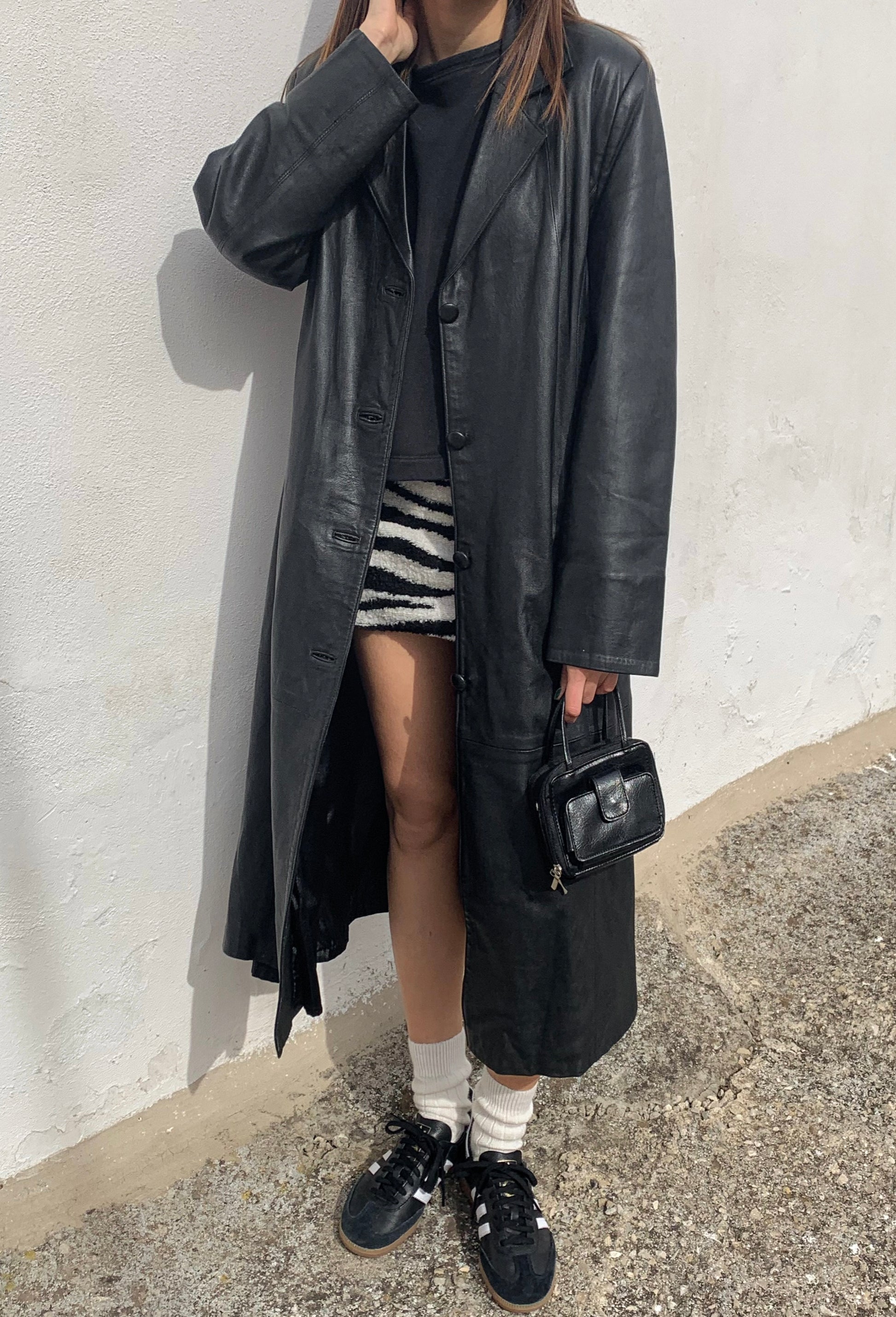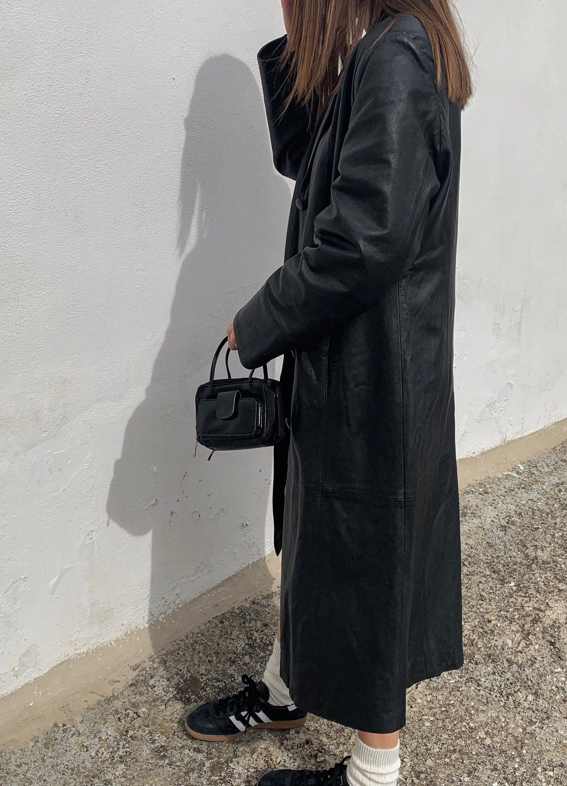 Black leather long trench coat
