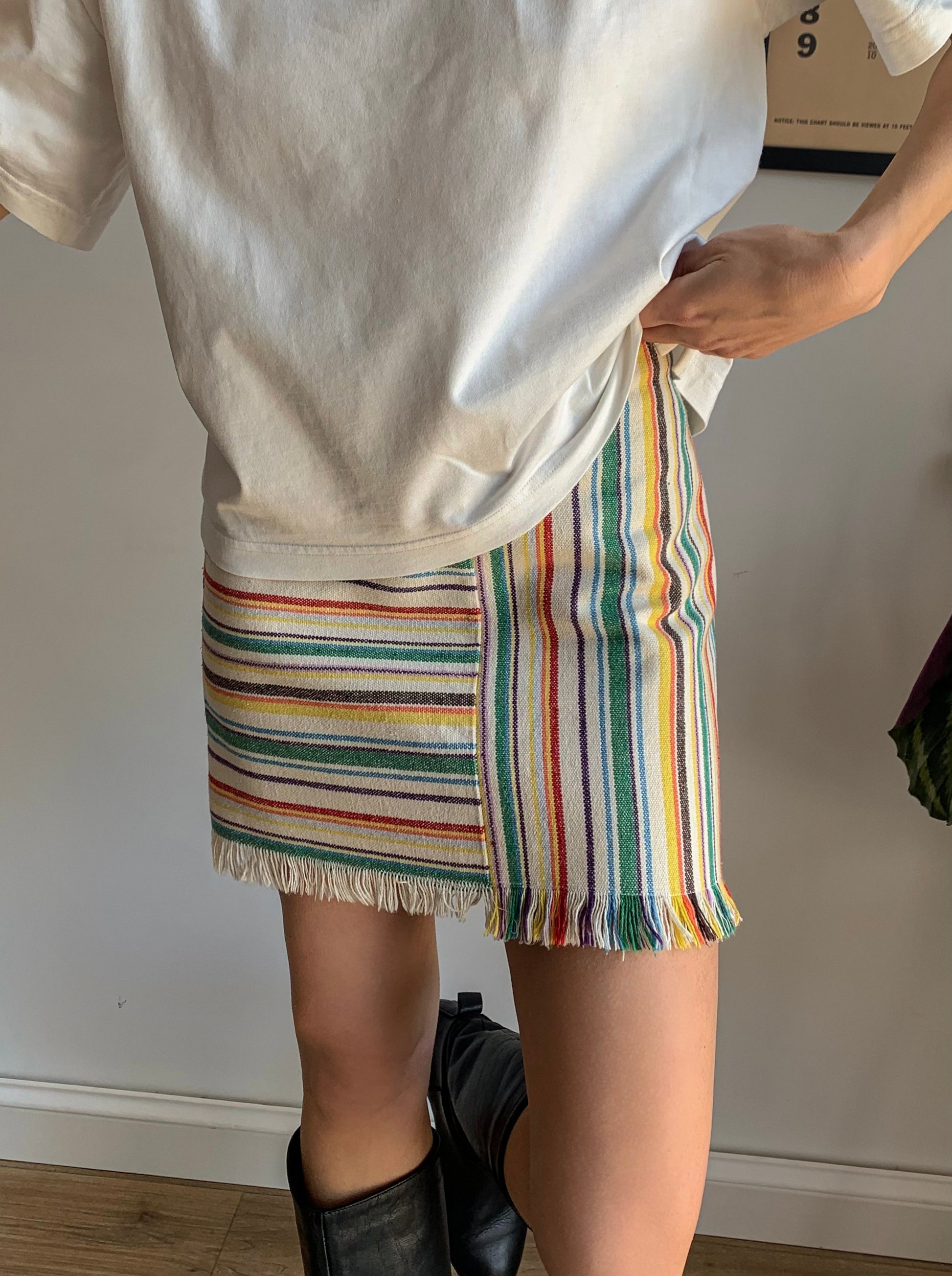 Dettagli: stupenda mini gonna a righe asimmetriche multicolor e frange sul fondo