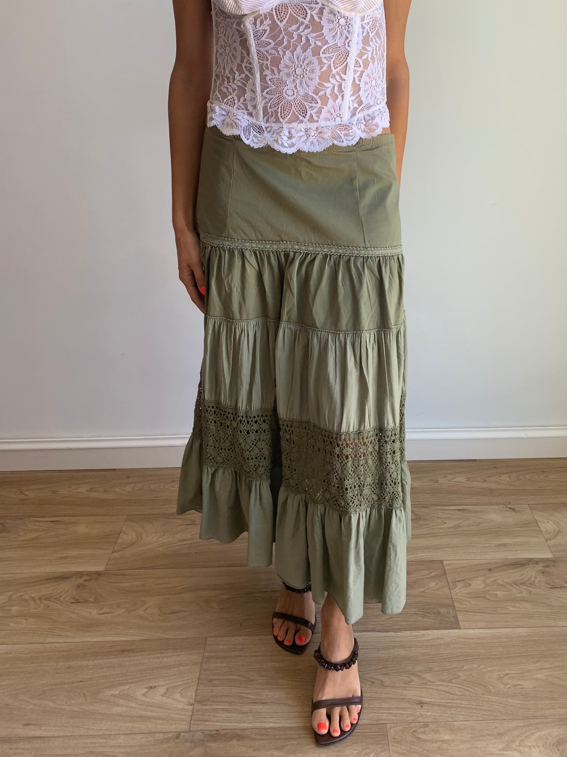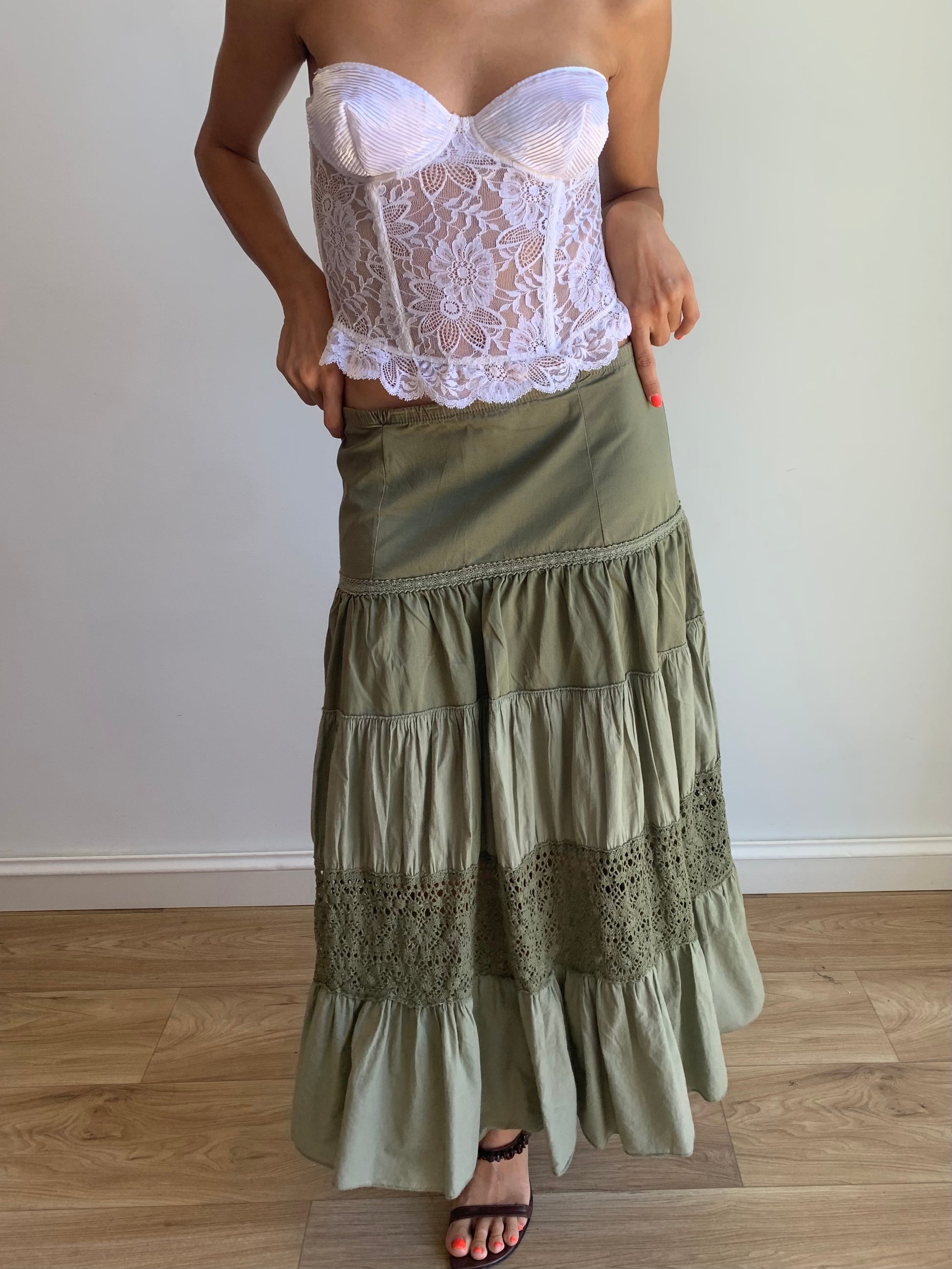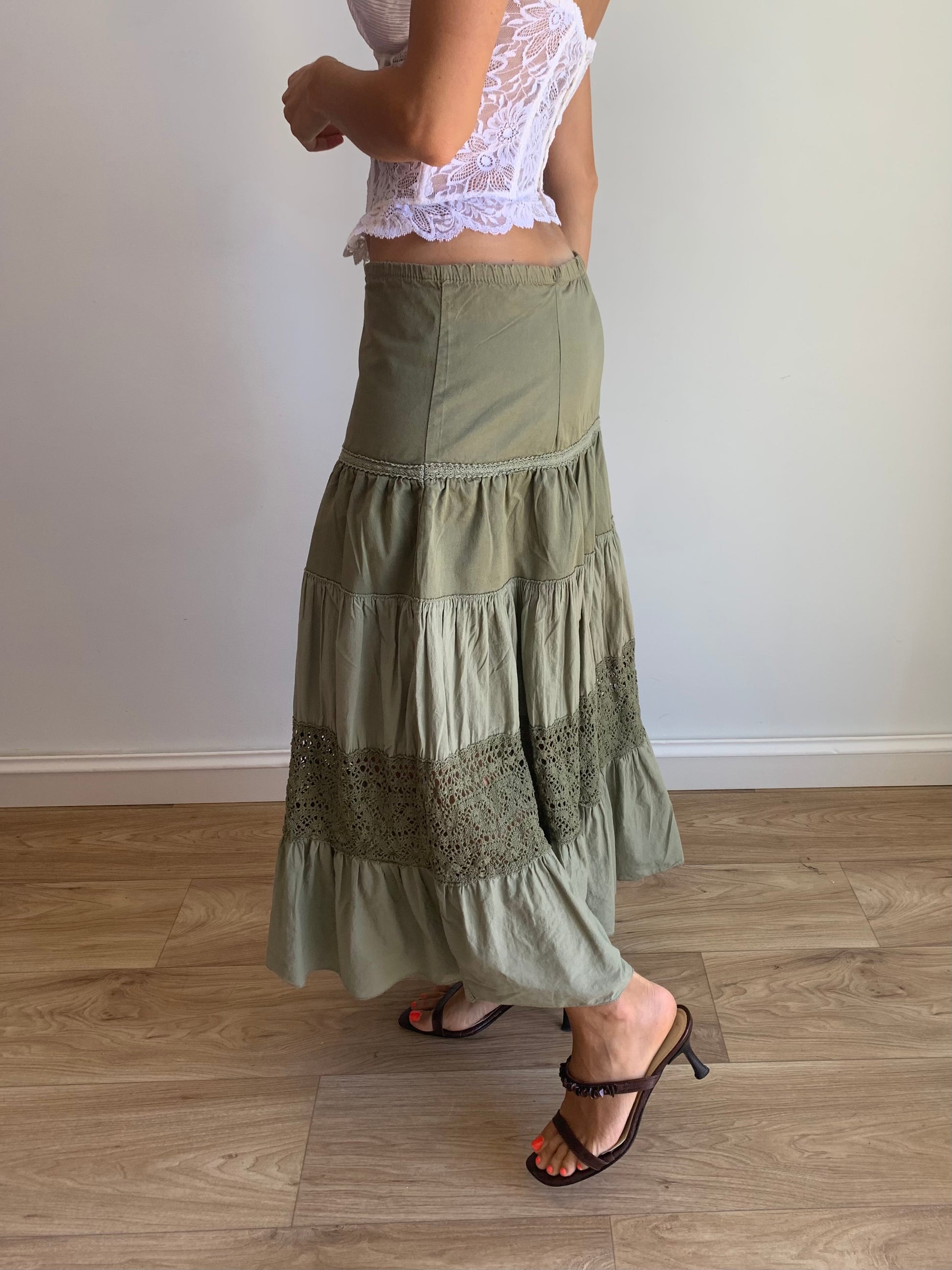 Dettagli: iconica maxi gonna a balze stile gipsy color verde oliva