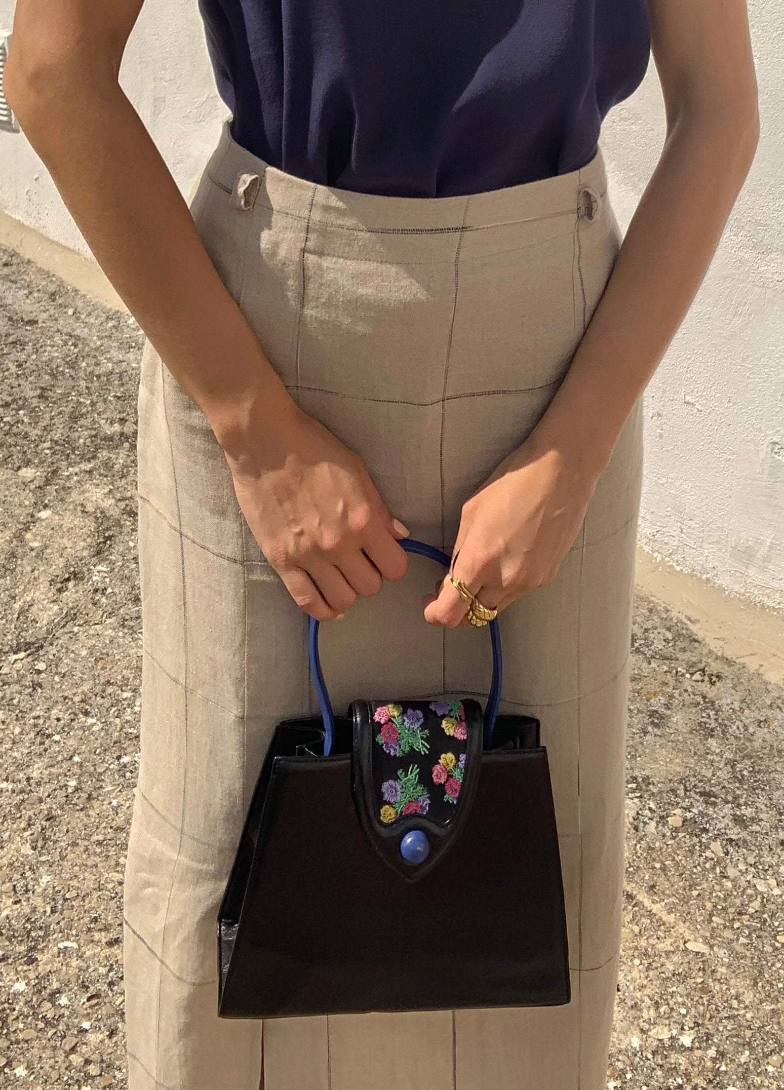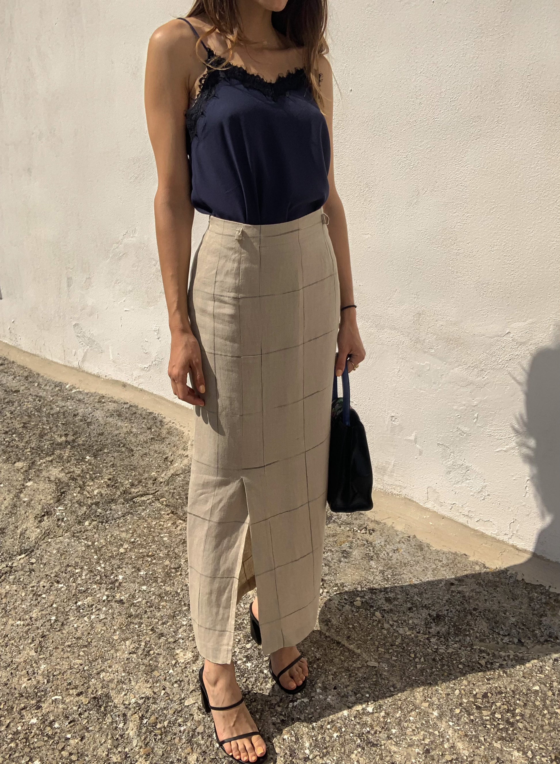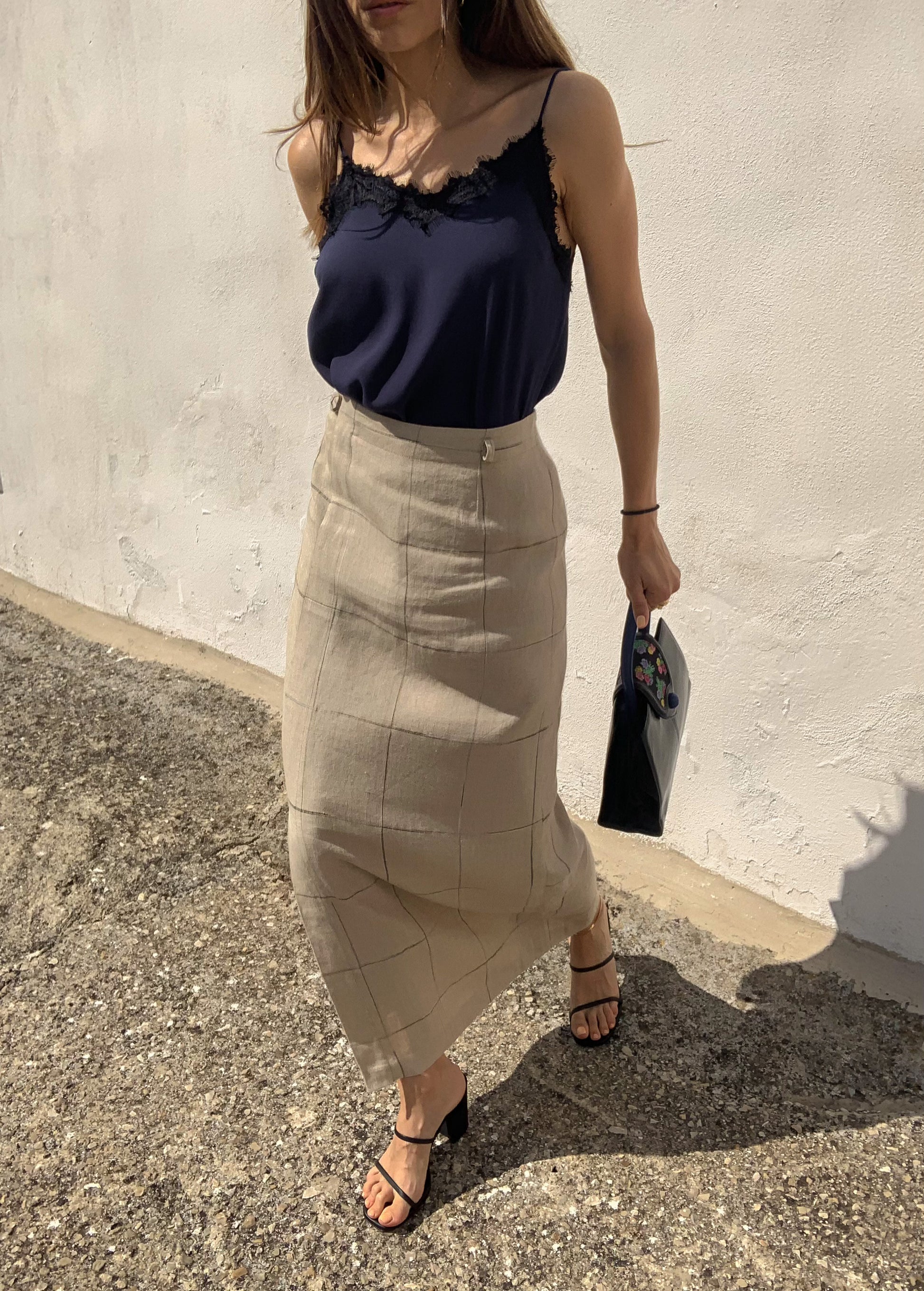 Dettagli: stupenda gonna vintagissima in 100 lino color burro e trama check a quadri sul blu e beige